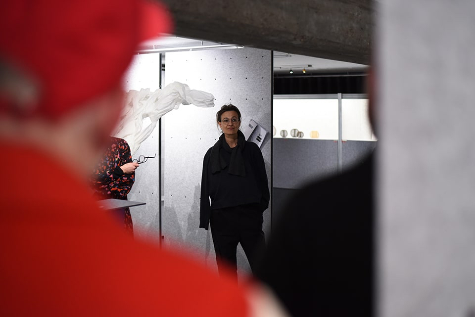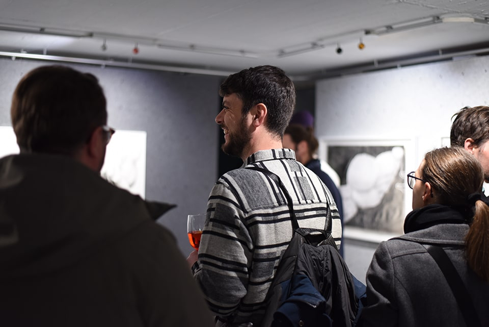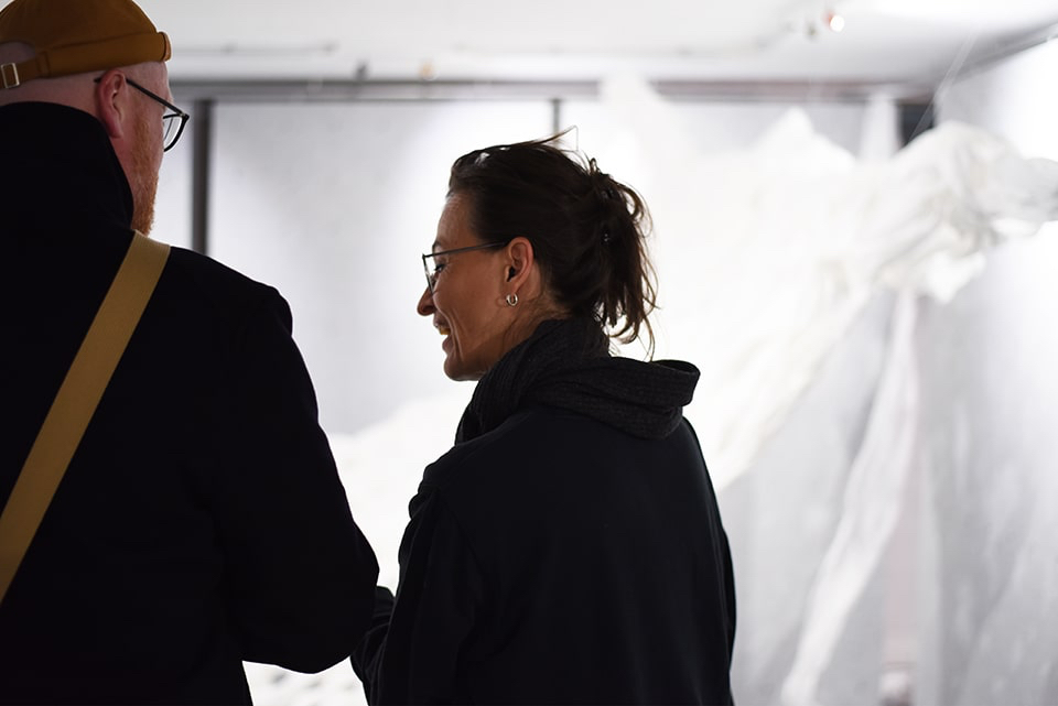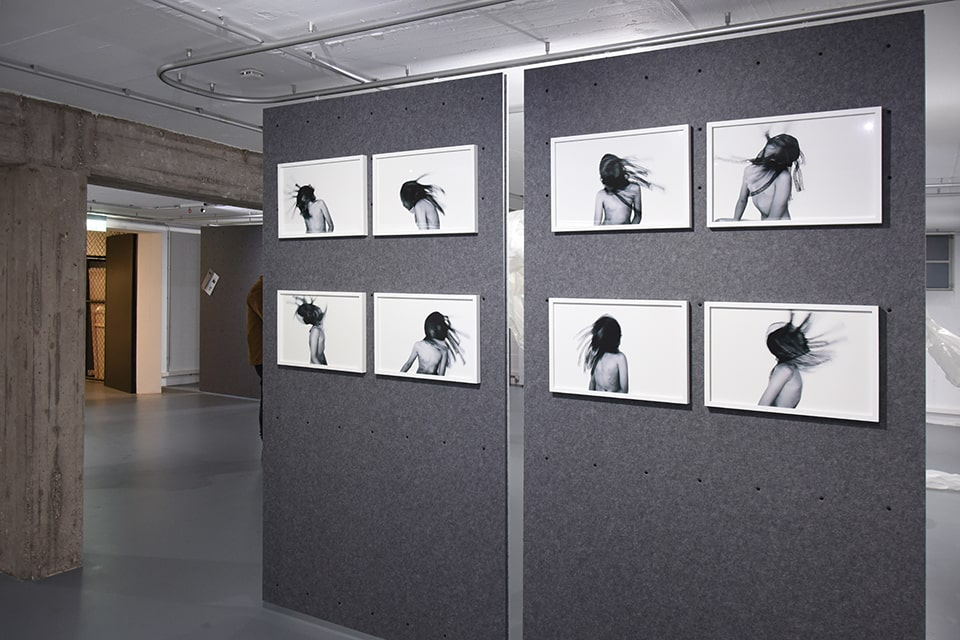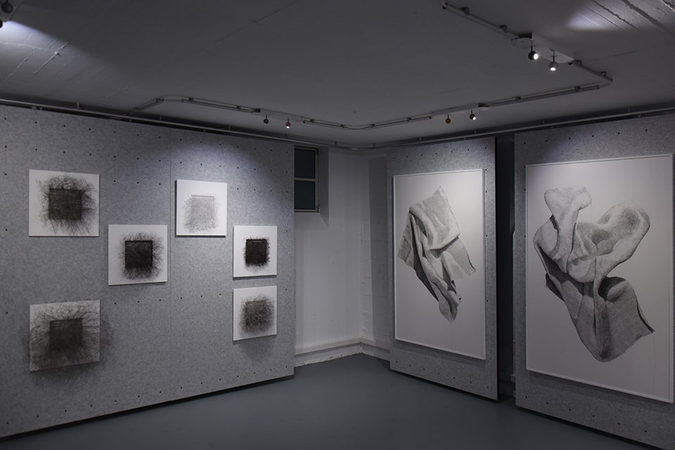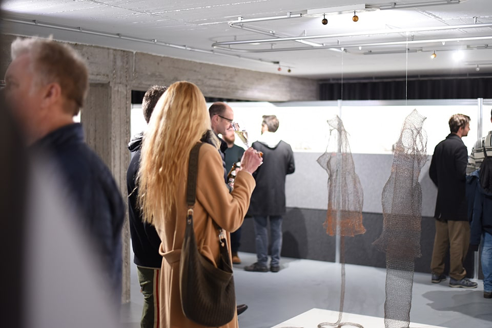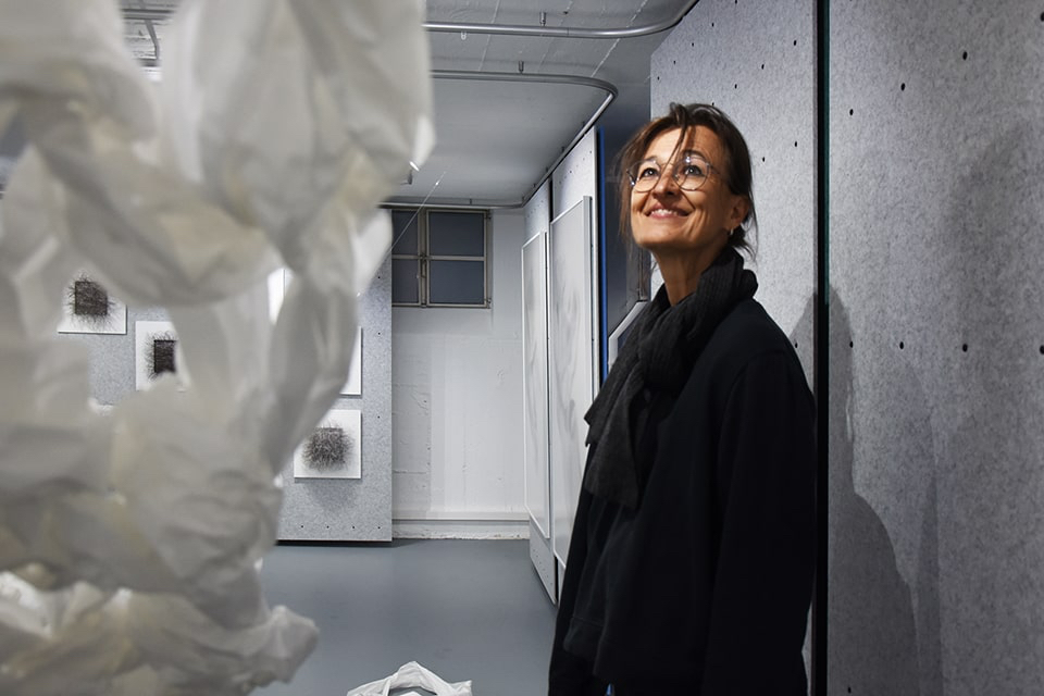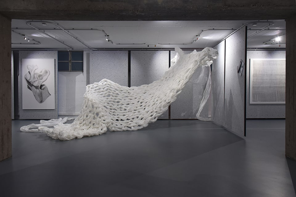Wenn wir die Galerie betreten, nehmen wir sofort eine synergetische Harmonie zwischen den ausgestellten Werken und der besonderen Räumlichkeit mit den flexiblen Wänden aus Filz wahr.