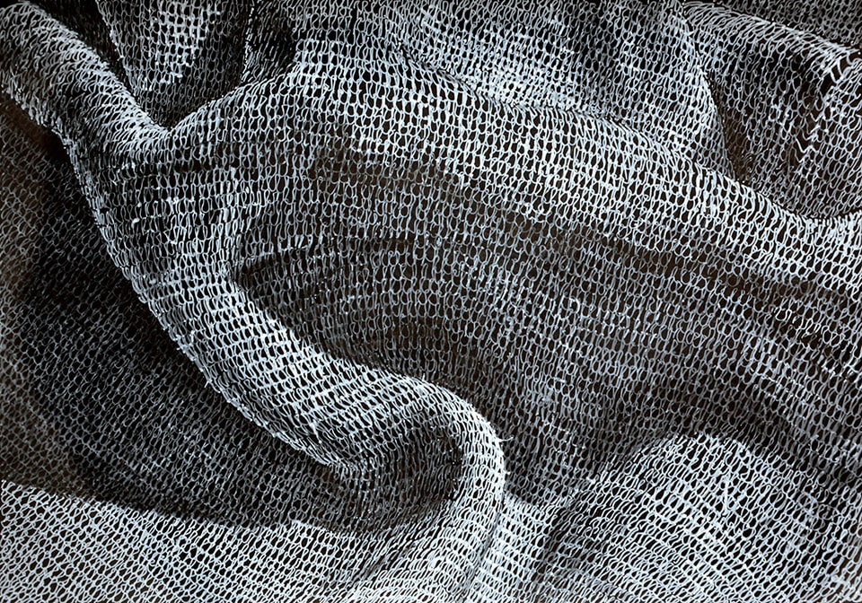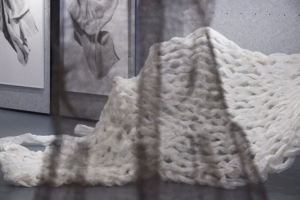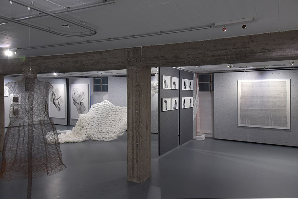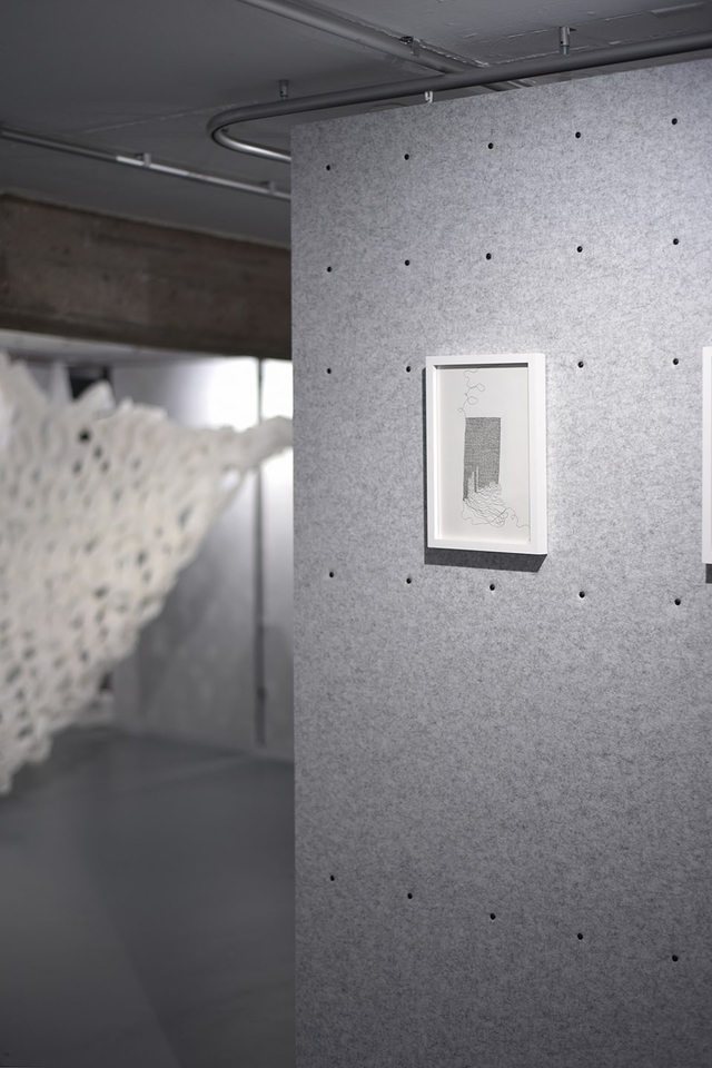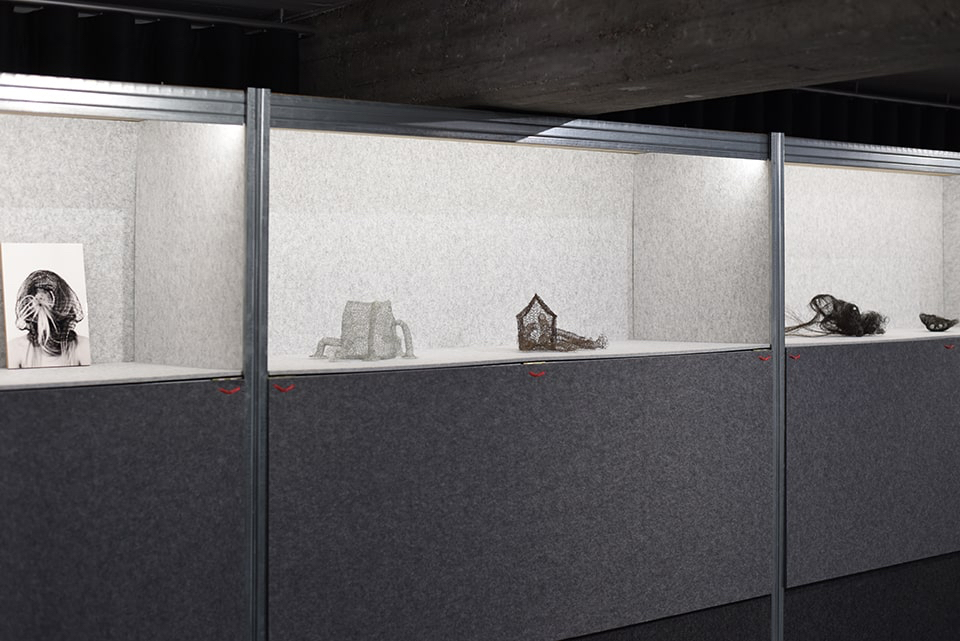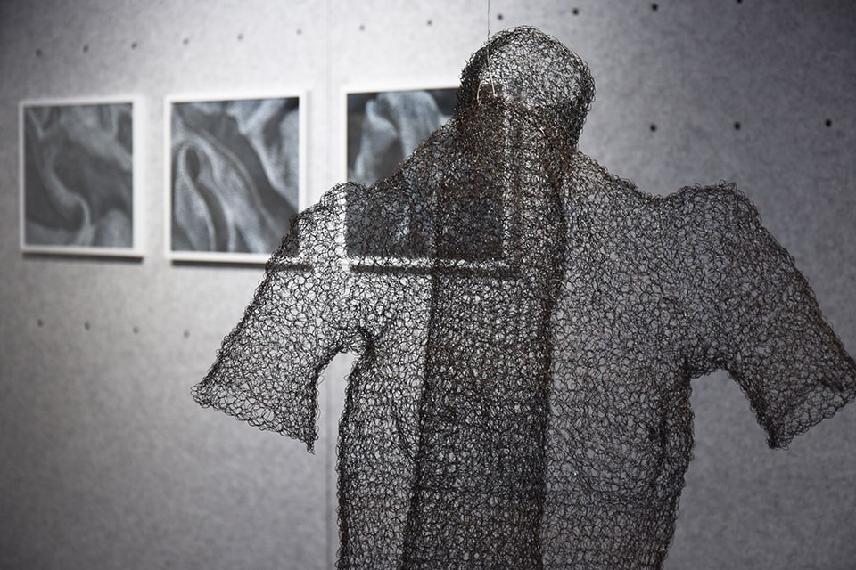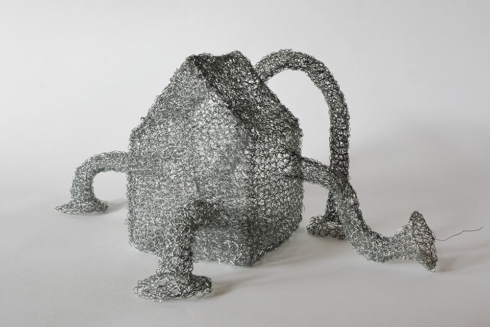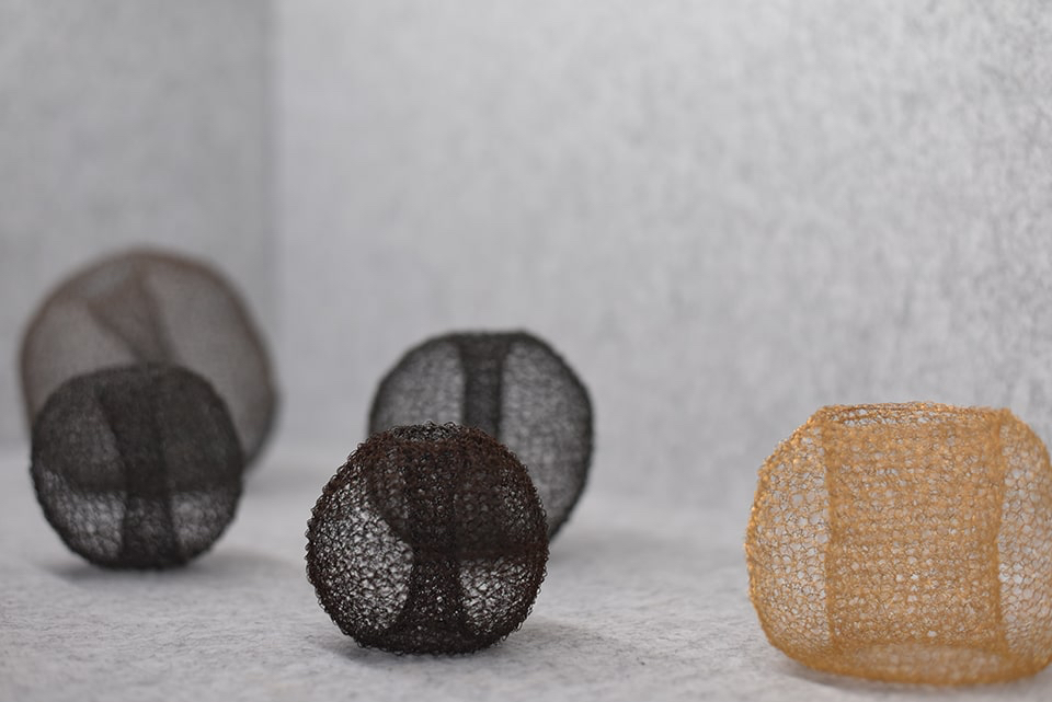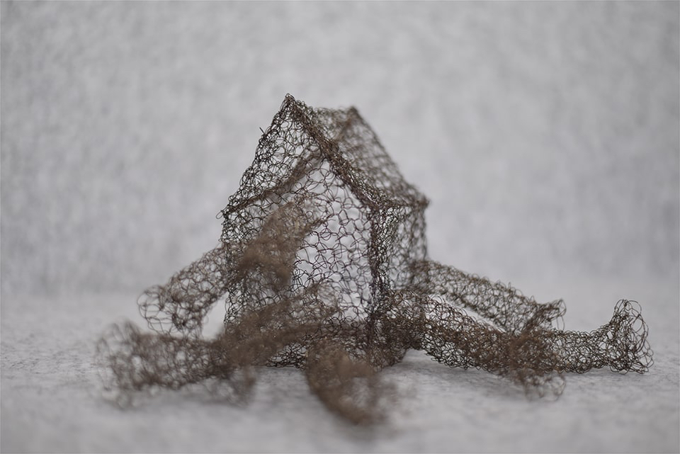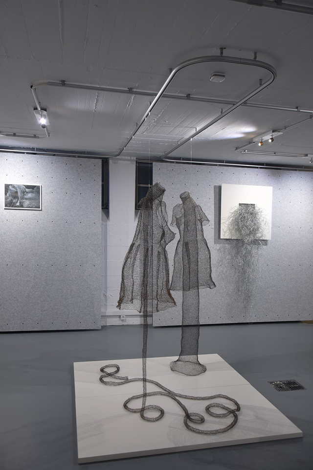 Ihr bevorzugtes Material für die dreidimensionale Umsetzung der zeichnerischen Idee ist Draht, ein Werkstoff, der sie vor einige Herausforderungen stellt. In zeit-, willens- und kraftaufwendigen Prozessen häkelt und strickt sie den Draht in endlosen Maschenketten oder als Gewebestrukturen und führt diesen zu neuen Formen. Es entstehen Raumgewebe, die den Unterschied von Innen und Außen aufheben.