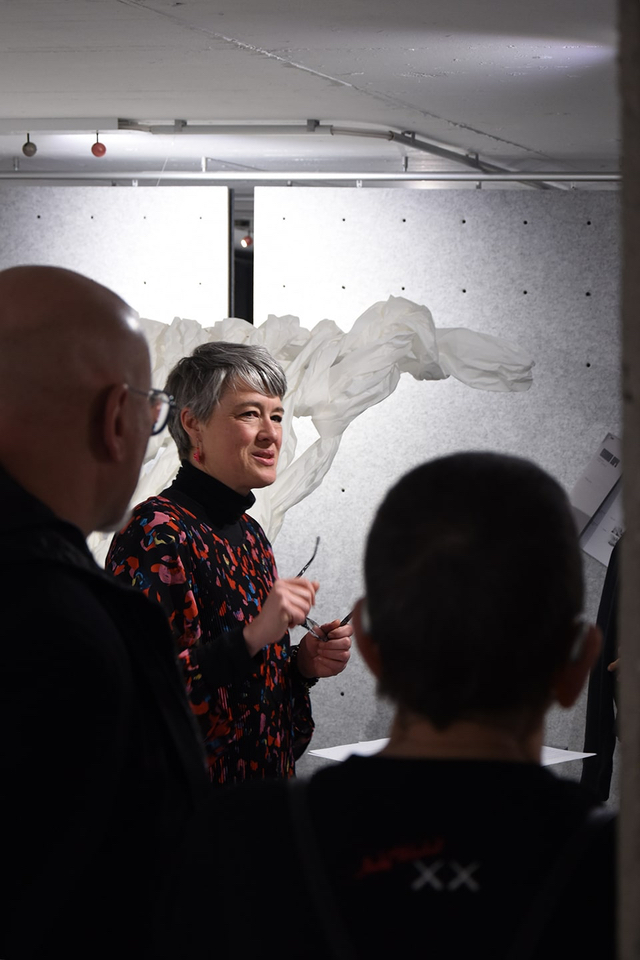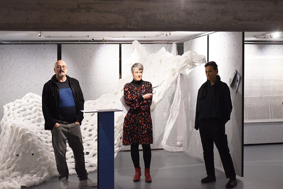 Die Masche, das Gewebe ist also das tragende Element dieser Ausstellung, Durchlässig, flexibel, fast schon in molekularer Dichte anwesend, wirft sie Fragen auf – nach Selbst- und Raumwahrnehmung, nach Auflösung undDurchlässigkeit, nach Raum und Zeit – dabei spannt sie spielerisch einen Bogen von Pipi Langstrumpf, die sich die Welt so macht, wie sie ihr gefällt, bis zu Einsteins Relativitätstheorie – ist Zeit relativ, verläuft sie linear?