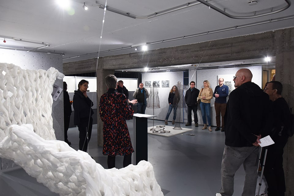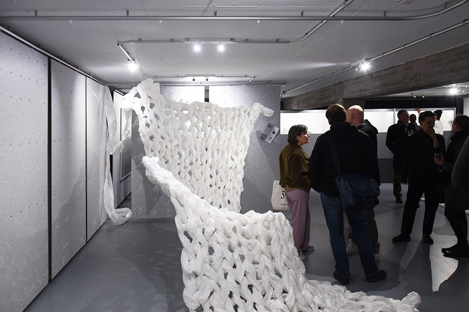 Aber eben nur auf den ersten Blick, denn Monika Supé ist hier Künstlerin und lässt die Architektin außerhalb des Ausstellungsraums zurück. Nicht nur die Technik, in der sie arbeitet – das traditionelle Handwerk des Strickens und Häkelns, allerdings nicht mit den dabei erwarteten Materialien –, kehrt die zuerst wahrgenommene Ästhetik völlig um, sondern auch der feine Humor und die Spielerei mit den Objekten.