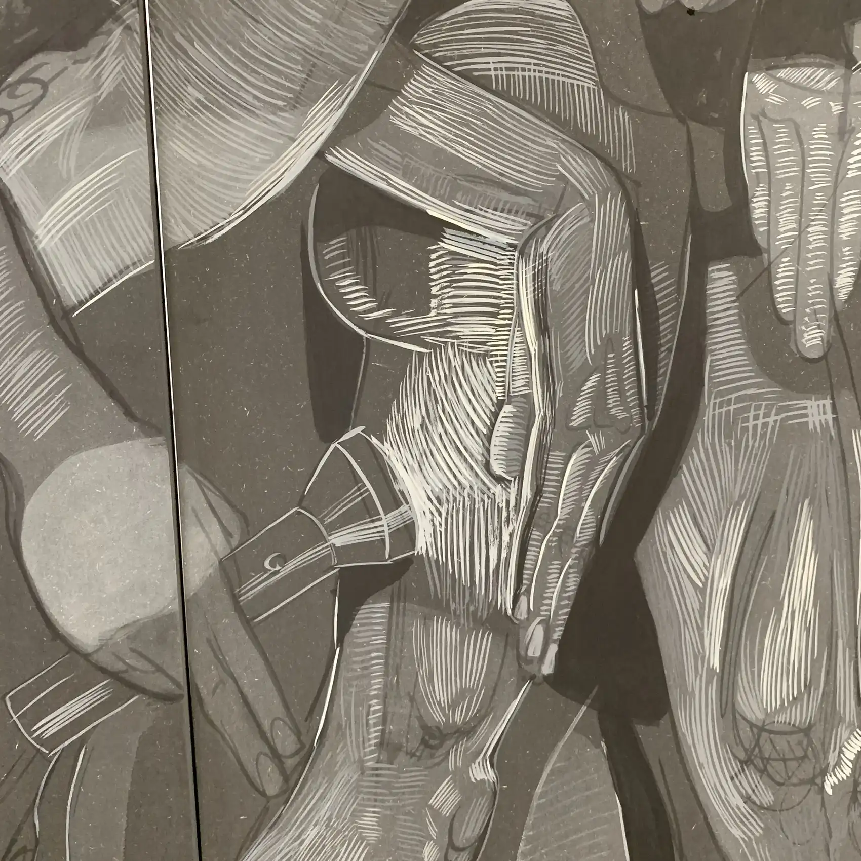 Tesfaye bezieht sich hier auf seinen Werkzyklus No Country for Young Men. Er hat sich auf unseren Vorschlag eingelassen, nicht wie bei diesen Arbeiten üblich mit Ölfarben auf Leinwand zu malen, sondern mit weißer Acrylfarbe auf einem schwarzen Holzwerkstoff.